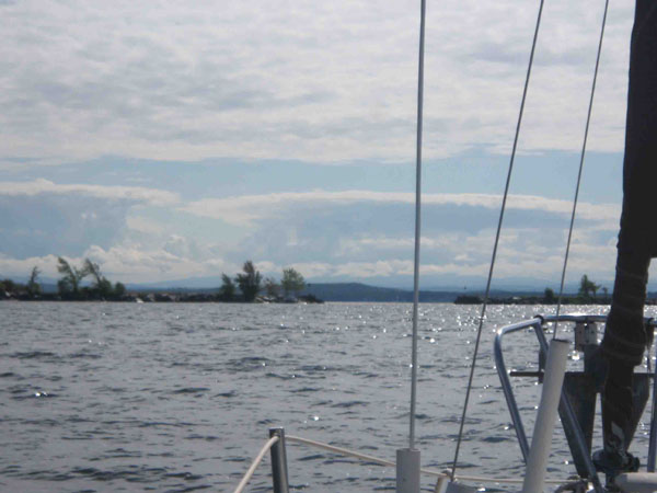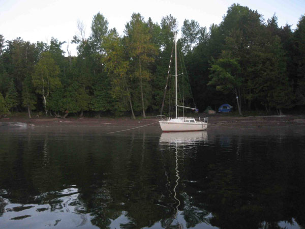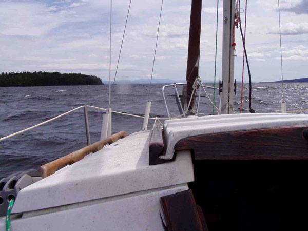 Anyway, we dropped a hook and tied the stern to a ring on shore set in concrete for just that purpose. We set up camp on shore and made ourselves comfortable while we waited for the lake to calm down. By evening the wind had died down so we hoped for some good sailing the next day. Unfortunately it turned out that Champlain takes a while to settle after it gets churned up. The next day with just an 8 mph breeze the waves were still at 3 feet. It took another day for it to calm down to 1 to 2.