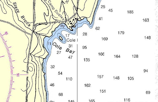 Motoring got me a bit more forward progress at the expense of comfort. Heading due north into the wind and waves meant less rolling and more crashing. Crashing into 3 and 4 footers meant lots of spray and this time of year the lake temps are in the upper 30's. Yikes that stuff is cold. Well, after a couple of hours of that maelstrom I found myself next to Cole Bay and decided to duck in and see if it offered protection from a north wind. Turned out it did. It's a really nice picturesque little bay that stays glasslike in a north wind. Right in the middle of the bay is an island oddly enough called Cole Island. :-) Between the island and the north shore of the bay is a beautiful anchorage. I suspect it's not so idylic in a south wind but on that day in that wind it was heaven.