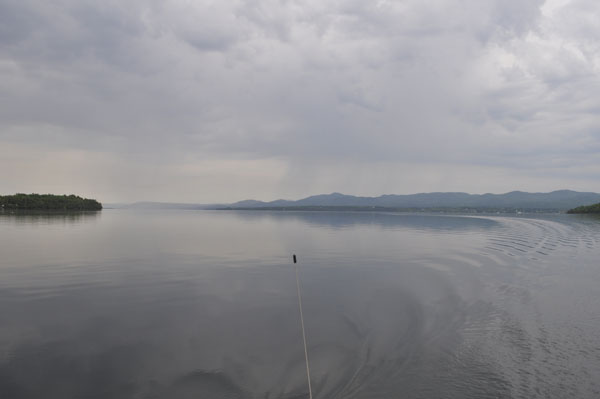 The view South leaving the harbor. I didn't notice it when I took this picture but you can see rain coming down on my slip in Port Henry on the right side of the picture